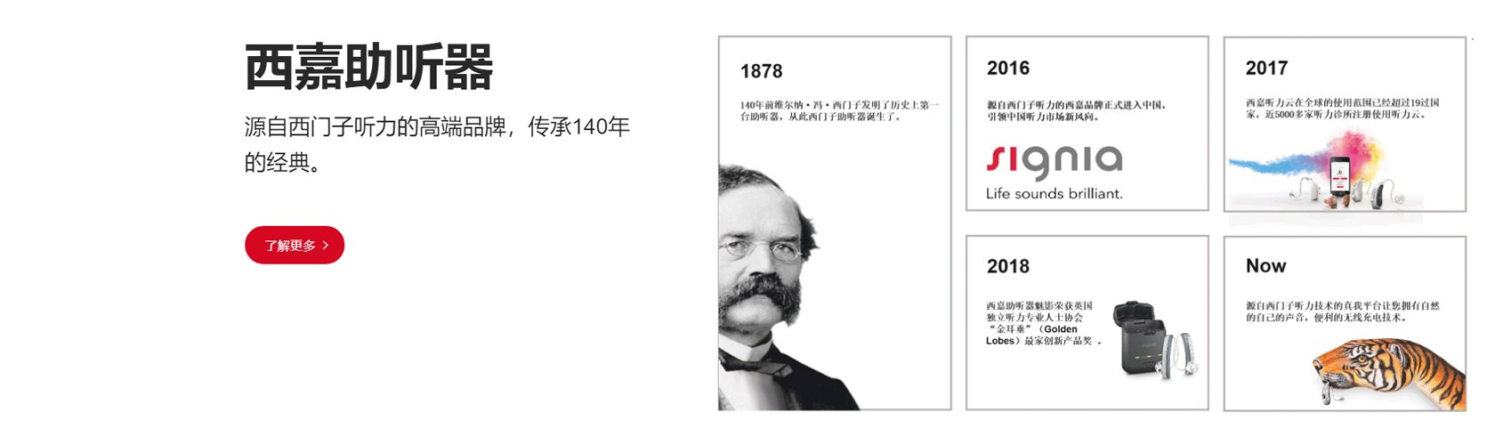 金華市康全醫療器械有限公司專業經營西嘉助聽器,西嘉助聽器源自西門子聽力,傳承140多年的經驗技術,在聽力研究、助聽器研發和生產等領域享有盛譽。其足跡遍布全球100多個國家和地區,不斷創新,竭盡推動聽力行業發展。西嘉助聽器繼承了西門子聽力逾百年的科技精髓,擁有強大的研發創新能力。我們將利用這些先進的產品技術為金華地區聽力損失患者提供專屬個人的聽力解決方案,為您解決聽力上的煩惱,重回有聲的精彩聽世界。